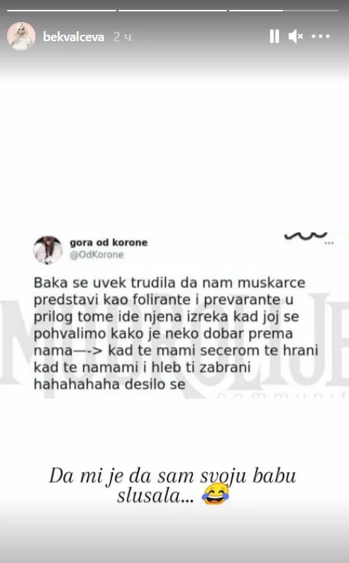 Naime, Bekvalčeva je objavila citat jednog od korisnika društvene mreže Tviter, u kome se očigledno pronašla, te je prekorila sebe što nije svoju baku poslušala.