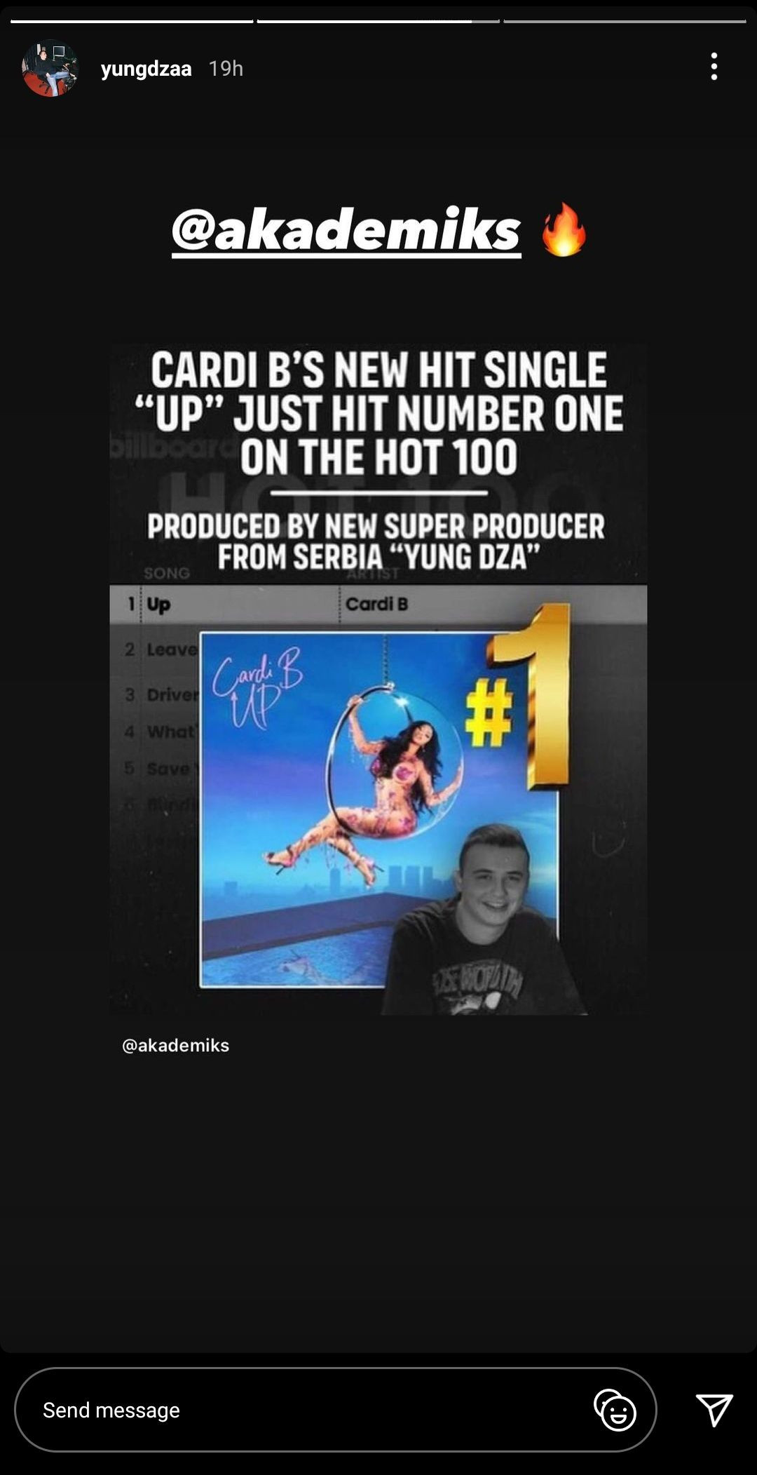 Sa pesmom „Up”, iza koje stoji dvadesetpetogodišnji producent iz Srbije poznat kao Jang Dža, reperka Kardi Bi po peti put se popela na sam vrh prestižne Bilbordove hot 100 liste. Pre ovoga, poslednji put je na ovom mestu uživala 2017. godine, s numerom „Bodak Yellow”.