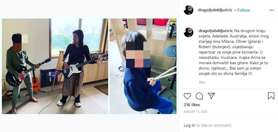 – Na drugom kraju sveta, Adelaid, Australija, sinovi mog starijeg sina Milana, Oliver (gitara) i Robert (bubnjevi), uvežbavaju repertoar za svoje prve koncerte. U nedostatku muzičara, majka Anna se morala dohvatiti bas gitare. Kako je to divno, retkost… Baš sam ja srećan čovek što su divna familija – napisao je kraj svoje objave avgustu 2020. godine, o svojoj porodici.