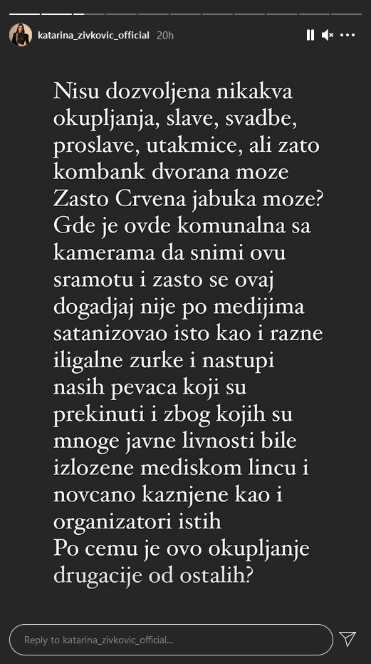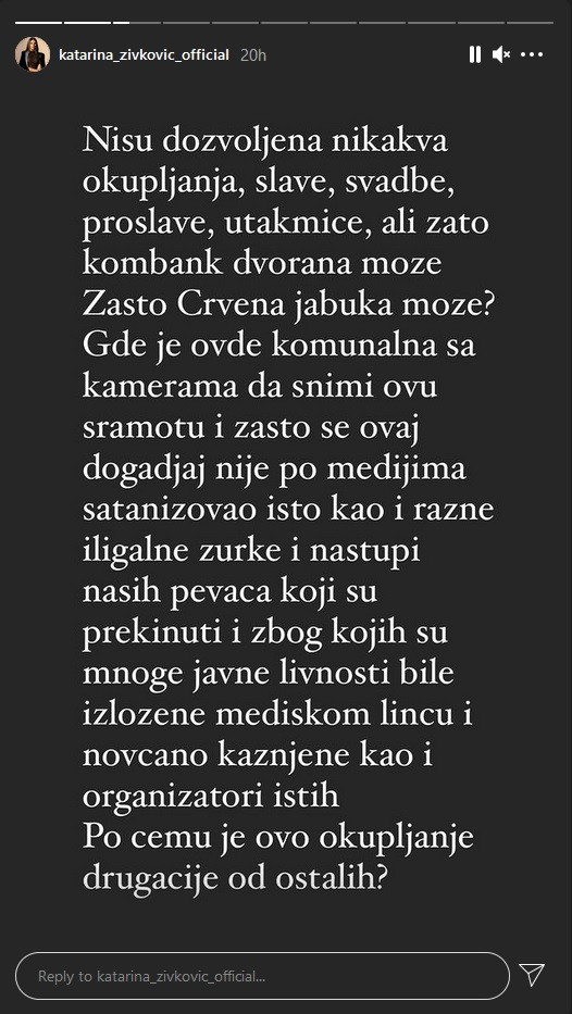 – Za vikend zatvaramo restorane, držimo distancu, plaćamo poreze kao da radimo puno radno vreme i sedimo kod kuće. Nisu dozvoljena nikakva okupljanja, slave, svadbe, proslave, utakmice, ali zato Kombank dvorana može. Zašto “Crvena jabuka” može? Gde je ovde komunalna sa kamerama da snimi ovu sramotu – napisala je pevačica u prvom Instagram storiju, ali kako je uhvatila zalet, tu se nije zaustavila.
