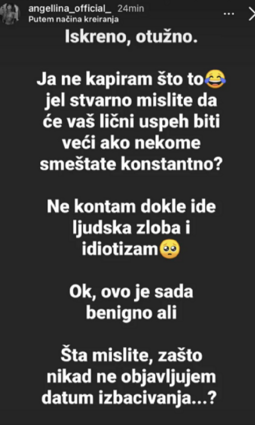 – Iskreno, otužno. Ja ne kapiram što to? Je l’ stvarno mislite da će vaš lični uspeh biti veći ako nekome smeštate konstantno? Ne razumem dokle ide ljudska zloba i idiotizam. Ok, ovo je sada benigno, ali… Šta mislite, zašto nikada ne objavljujem datum izbacivanja…? – napisala je Angellina na Instagramu vidno iznervirana.