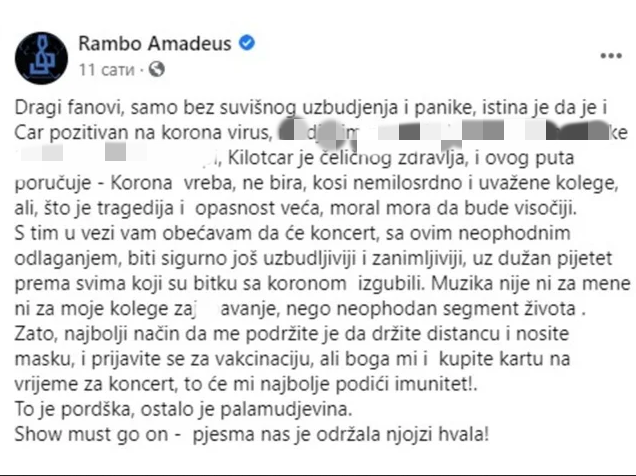 – Dragi fanovi, samo bez suvišnog uzbuđenja i panike, istina je da je i Car pozitivan na korona virus. Kilotcar je čeličnog zdravlja, i ovog puta poručuje – Korona vreba, ne bira, kosi nemilosrdno i uvažene kolege, ali, što je tragedija i opasnost veća, moral mora da bude viši. S tim u vezi vam obećavam da će koncert, sa ovim neophodnim odlaganjem, biti sigurno još uzbudljiviji i zanimljiviji, uz dužan pijetet prema svima koji su bitku sa koronom izgubili. Muzika nije ni za mene ni za moje kolege zaj*bavanje, nego neophodan segment života. Zato, najbolji način da me podržite je da držite distancu i nosite masku, i prijavite se za vakcinaciju – poručio je Pušić putem Fejsbuka.