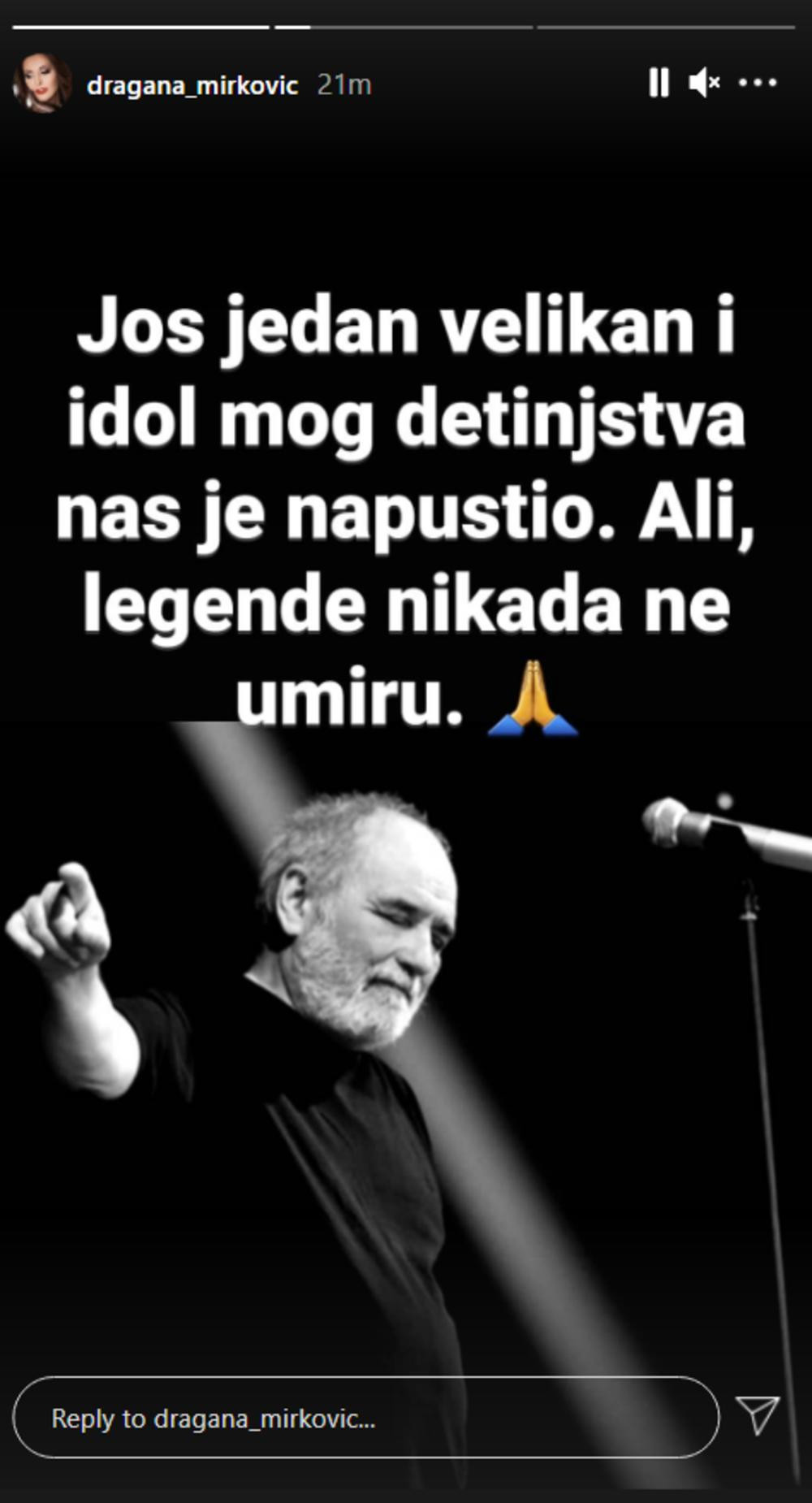 – Još jedan velikan i idol mog detinjstva nas je napustio. Ali legende nikada ne umiru – napisala je na Instagramu pevačica Dragana Mirković.