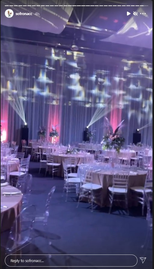 Kako se može videti po fotografijama koje su isplivale na društvenoj mreži Instagram, sala u kojoj je napravljena proslava bila je sva u roze i ljubičastim tonovima, veliki aranžmani cveća našli su se na stolovima, a stolice za okruglim stolovima su bile providne.