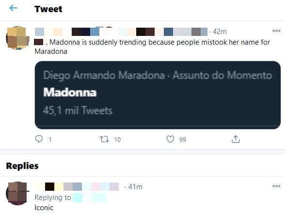 Čuveni Dijego Armando Maradona, jedan od najboljih fudbalera svih vremena, preminuo je danas u 60. godini, međutim na društvenoj mreži Tviter došlo je do velike zabune. Naime, umesto od njega, fanovima širom sveta potkrala se greška, pa se uporno opraštaju od pop kraljice – Madone. Pojedinci su, u pokušaju da ,,postave stvari na svoje mesto” (i ujedno s velikim čuđenjem) pokušali da ,,ispeglaju stvar”, ali ipak im nije baš polazilo za rukom.