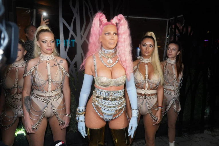 Jelena je nosila srebrne čizme do butine, pa se okitila lancima, kristalima, cirkonima. Plavi kompet koji je nosila istakao je sve njene atribute, a roze kosu vezala je u dva repića, a oni i te kako podsećaju na frizuru Pipi Duge Čarape.