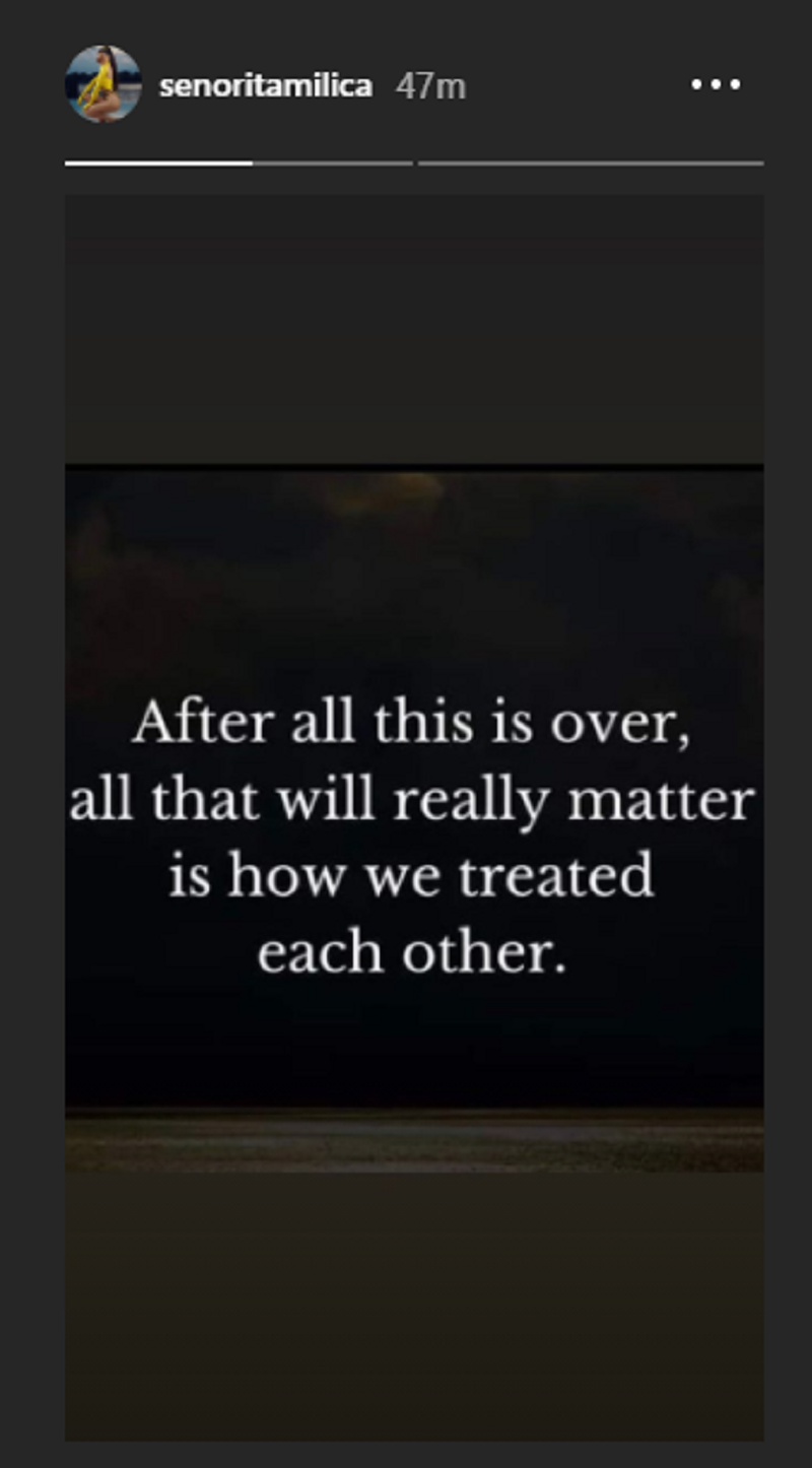 – Kad se sve ovo bude završilo, jedino će biti važno kako ćemo se ponašati jedni prema drugima – napisala je Milica, a zatim objavila i kišno nebo uz slovo V i emotikone srca, golubova i sklopljenih ruku koje se mole.
