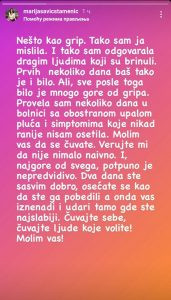 – Nešto kao grip. Tako sam ja mislila. I tako sam odgovarala dragim ljudima koji su brinuli. Prvih nekoliko dana baš tako je bilo. Ali, sve posle toga bilo je mnogo gore od gripa. Dva dana ste sasvim dobro, osećate se kao da ste ga pobedili, a onda vas iznenadi i udari tamo gde ste najslabiji. Čuvajte sebe, čuvajte ljude koje volite. Molim vas – napisala je Marija.