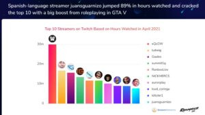 Na šemi možemo da vidimo da su Just Chatting, GTA V, League of Legends, Call of Duty: Warzone i Dota 2 zabeležili porast gledanosti, dok je gledanost Fortnite, Valorant, Minecraft, CS:GO i Apex Legends kategorija opala. Još jedna kategorija koje je zabeležila solidan porast gledanosti je Sports, koja je u aprilu po prvi put dostigla 10 miliona sati pregleda.