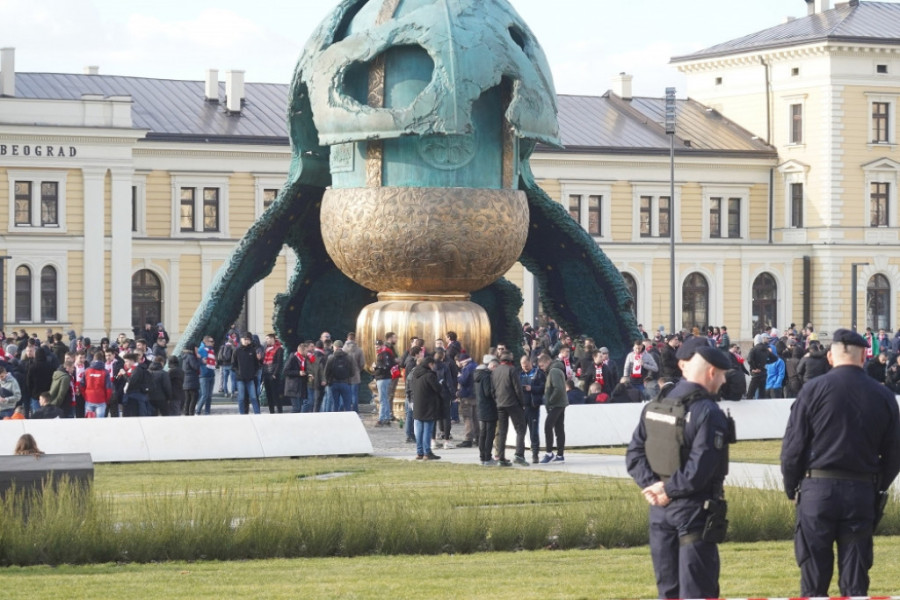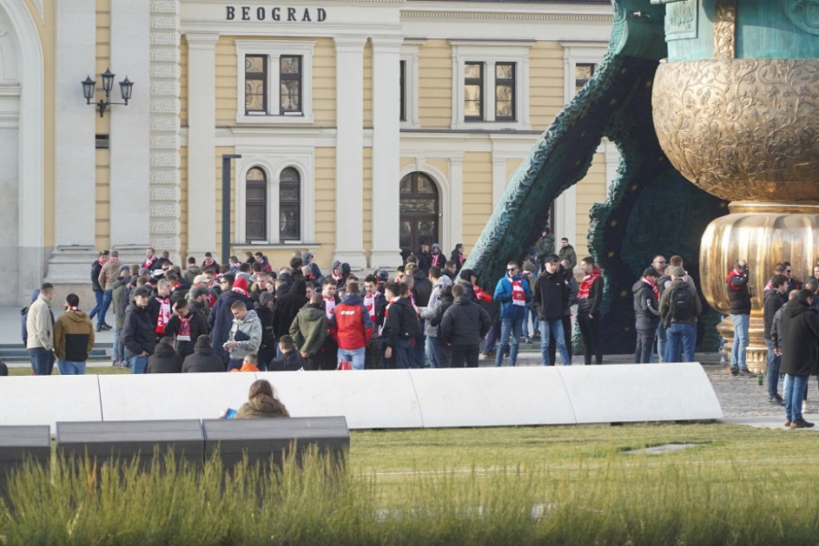 Na najveći srpski stadion večeras stiže Čukarički, a Zvezdini navijači u dobroj meri su se odazvali pozivu, pa su se nekih sat i po vremena pre početka meča okupili ispred spomenika Stefanu Nemanji odakle su u korteu, praćenom pesmom i pirotehničkim sredstvima, krenuli ka stadionu „Rajko Mitić“.