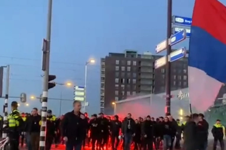 Navijači Partizana, pretpostavlja se da je nekoliko stotina u pitanju, prošetali su ulicama Roterdama u korteu na čijem je čelu bio veliki srpski barjak.