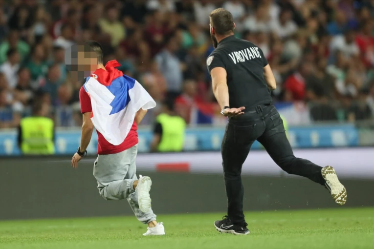 Naime, tokom susreta u Ligi nacija, jedan navijač Srbije sa zastavom je upao na teren. Odmah su se aktivirali i pripadnici obezbeđenja, te je, nakon što je pretrčao teren po širini, oboren i izbačen sa stadiona u Ljubljani.