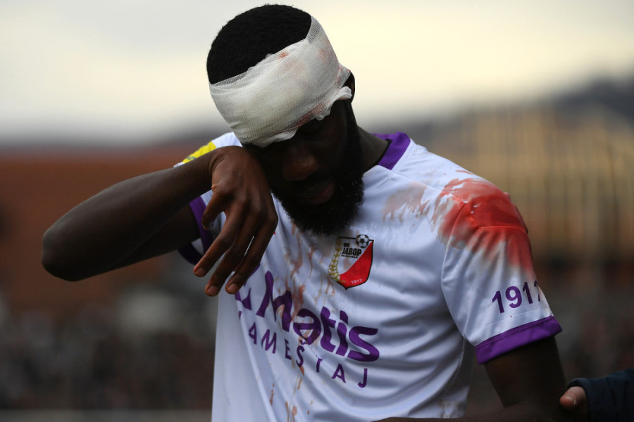 Sudar glavama, Dolmagić i Marković. Kapitenu Partizana raskrvavljena glava, Ukazuje mu se pomoć. Kraći prekid.