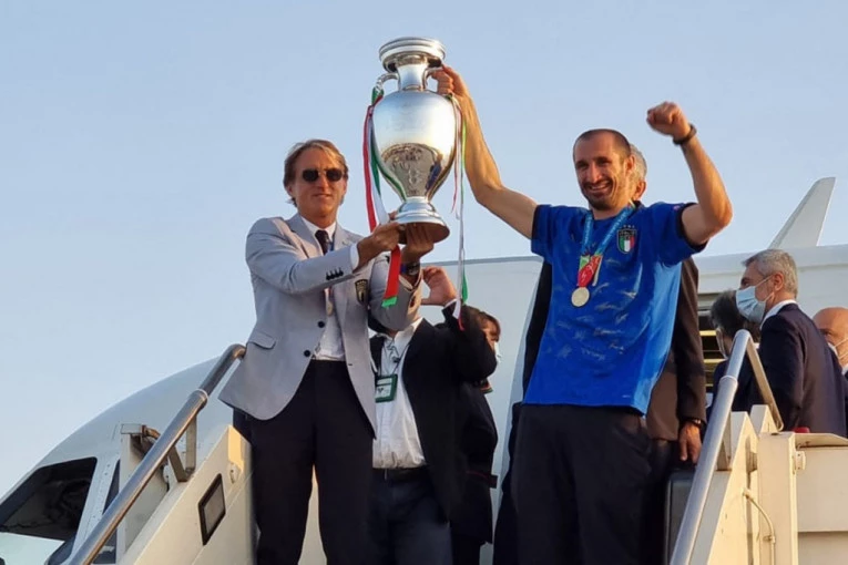 Pehar su iz aviona nacionalne avio-kompanija “Alitalija” izneli selektor Roberto Mančini i kapiten Đorđo Kjelini.