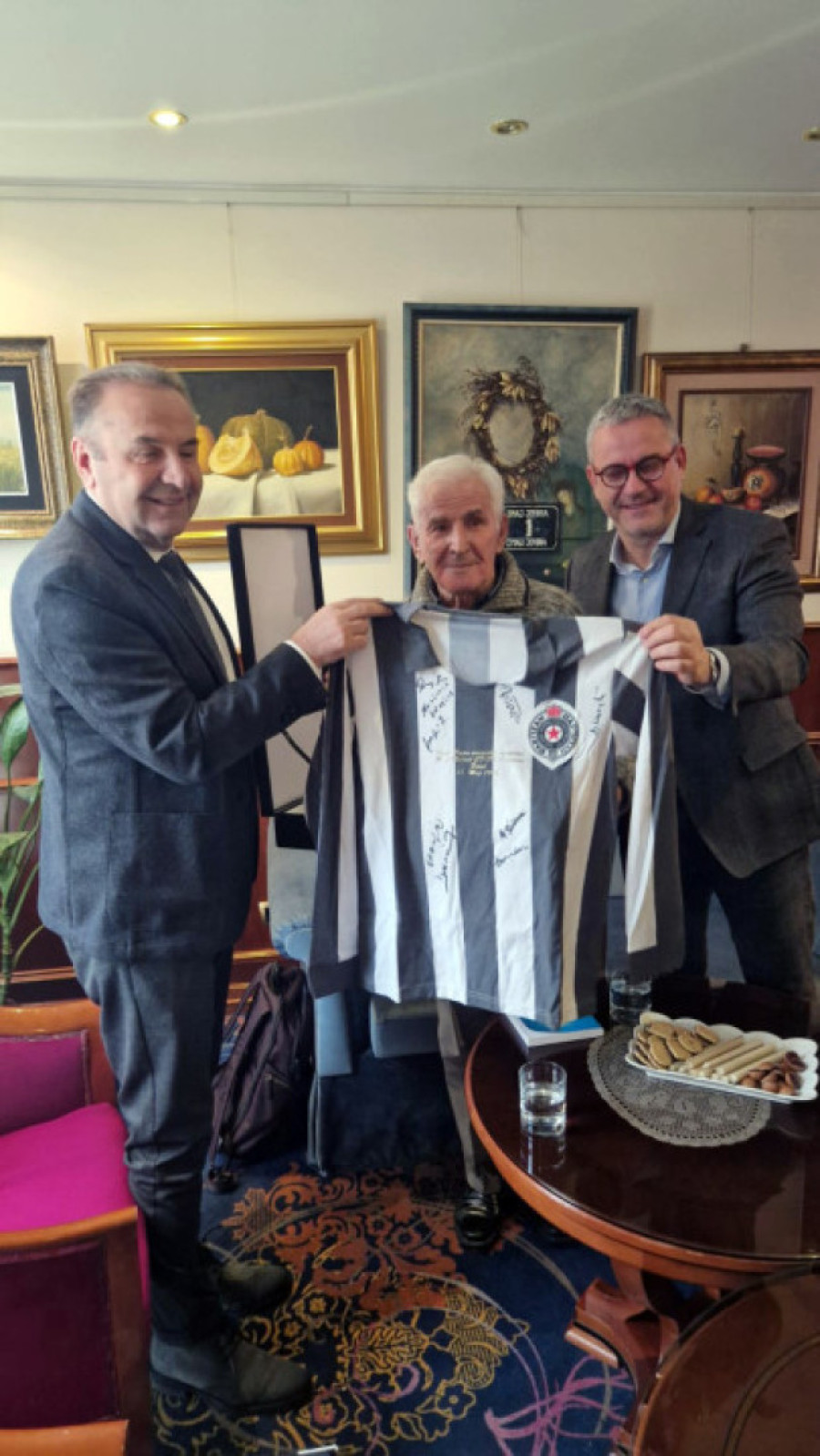 Partizanova delegacija posetila legendarnog fudbalera: Oni njemu plaketu i dres, a on njima memoare (GALERIJA)