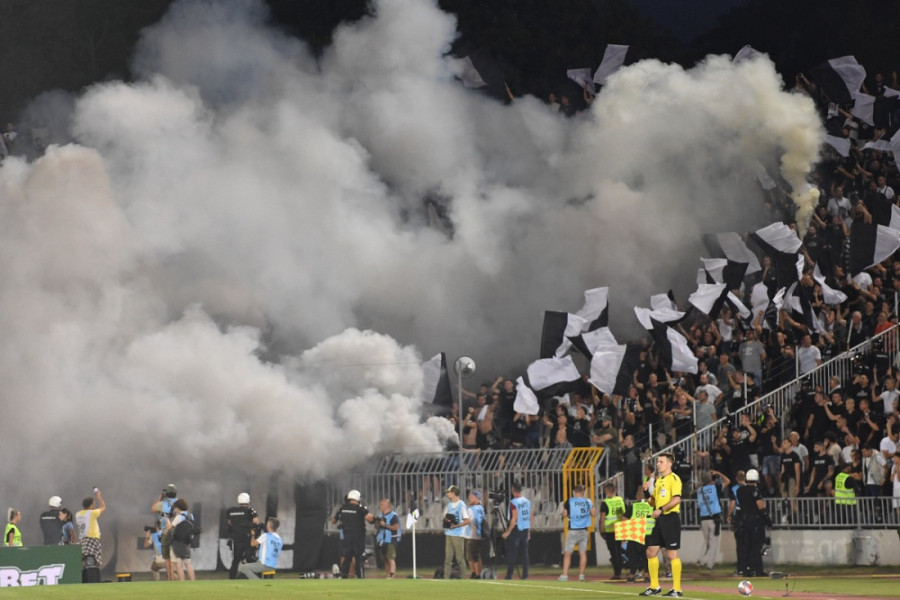 1. minut - Kratka pauza zbog dima od pirotehnike navijača Partizana.