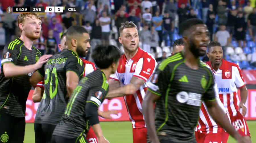 7. minut - Tiknizjan pravi faul. Seltik ima slobodan udarac sa desne strane. Na kraju se brani Zvezda i lopta je izneta iz kaznenog. Pokušaj kontre brzo osujećen.
