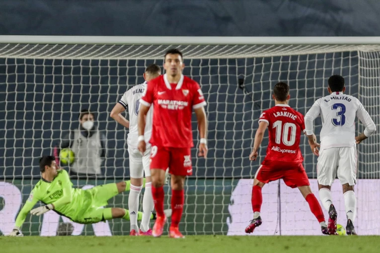 A, onda se dogodila neverovatna situacija. Benzema je krenuo u kontru, Bono ga je oborio, sudija je pokazao na penal. Karim je uzeo loptu i čekao da izvede jedanaesterac, da bi onda usledila reakcija VAR sobe. Pre te kontre su gosti imali korner, a posle gledanja snimka je ustanovljeno da je Militao u skoku igrao rukom u kaznenom prostoru. Sudija Munuera je pogledao snimak i pokazao na „kreč“ na drugoj strani. Rakitić je preuzeo odgovornost, poslao Kurtou u jednu, loptu u drugu stranu.