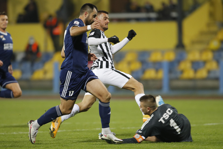 Ispalo je, ipak, da su stradali od svog oružja i to već u 23. minutu. Jedan pokušaj pritiska završio se dalekim ispucavanjem lopte Aleksandra Šćekića na suprotnu stranu, više iz želje da otkloni opasnost nego da proigra svoje najisturenije saigrače, a dogodilo se baš ovo drugo. Čitava defanzivna linija TSC bila je izbačena ovim potezom iskusnog Crnogorca, čiju je loptu u punom trku primio Filip Holender i već u drugom dodiru sa njom doneo prednost gostima – 0:1.