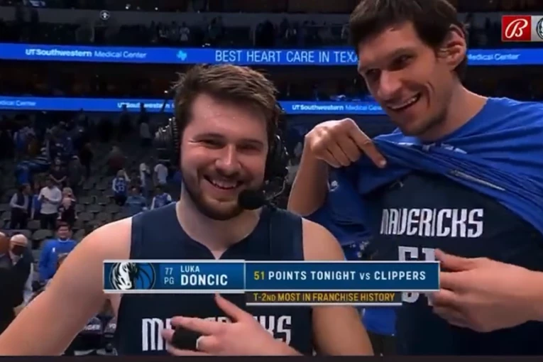 Tokom Lukinog intervjua nakon meča, Bobi je ušao u kadar i podigao majicu da pokaže dres. Nije to slučajno. Marjanović na dresu nosi broj 51, što je upravo broj poena koji je Dončić postigao.