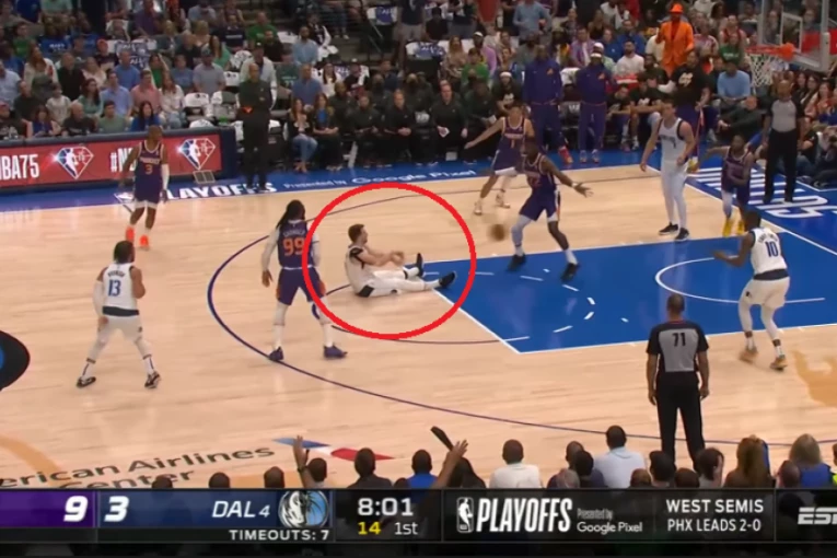 Dončić je prilikom jednog šuta pao na parket, akcija se nastavila, a on je pratio i nije stigao da ustane. Pomalo bizarno, lopta mu se ponovo našla u rukama, a on je pokazao vrhunsku košarkašku inteligenciju, pošto je jako brzo video Dorijana Fini-Smita i uposlio ga za koš: