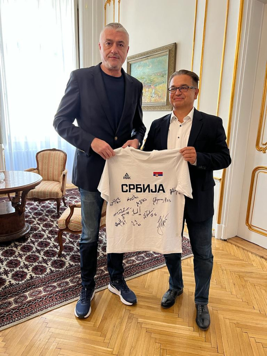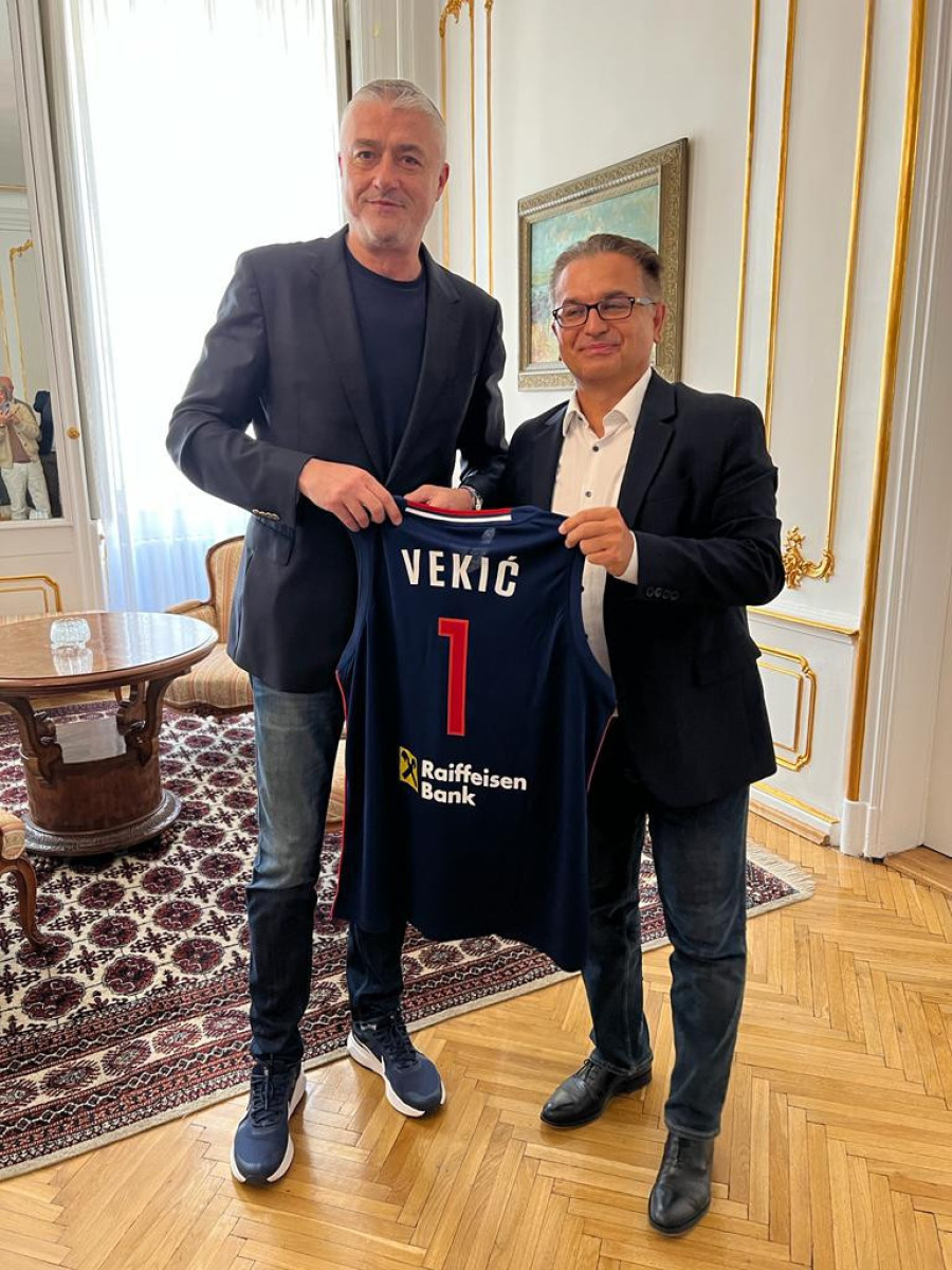 Tom prilikom, predsednik saveza, je uručio ambasadoru Vekiću dres reprezentacije sa njegovim prezimenom i majicu sa potpisima naših igrača.