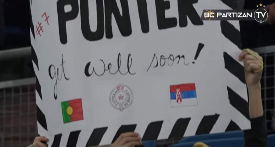 U samoj dvorani devojčica i dečak istakli su i transprarent sa porukom kapitenu Kevinu Panteru da se što pre oporavi, uz nacrtane zastave Portugala, Srbije i grb Partizana.