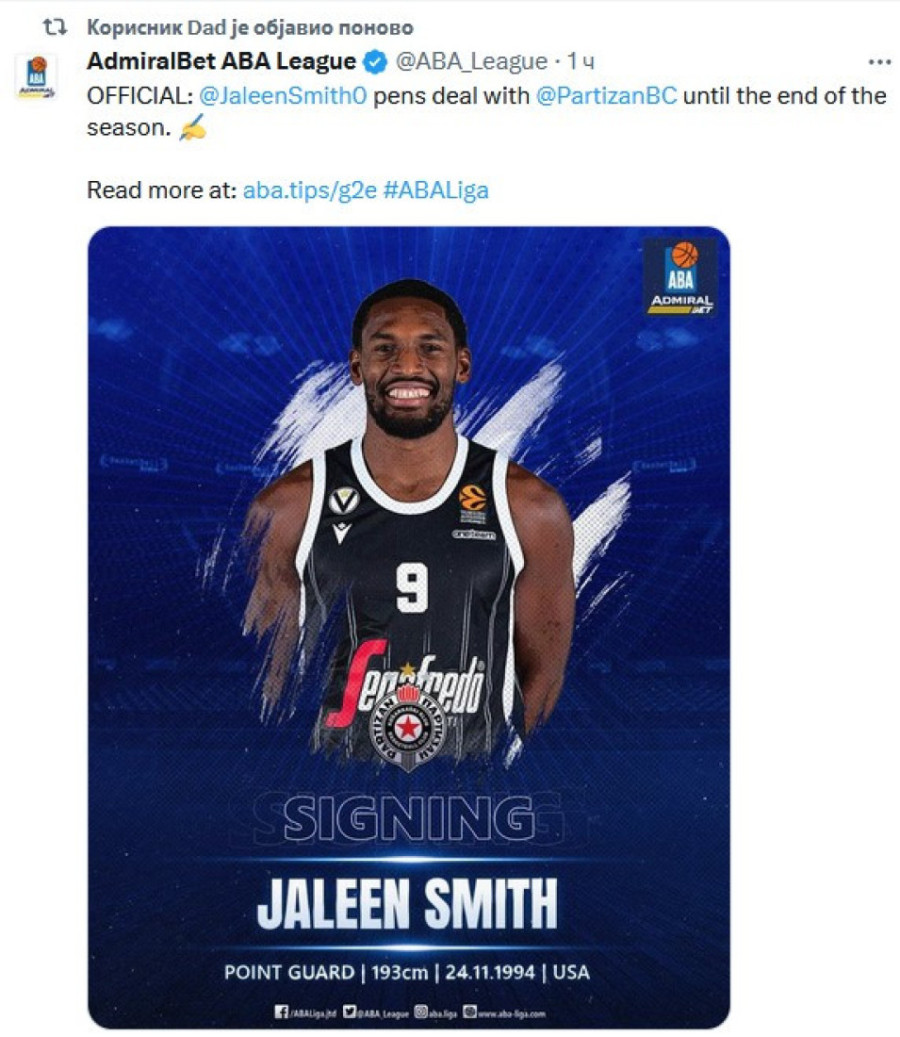 Smit se međutim nije oglašavao, nekom porukom, ali je nekoliko objava na X društvenoj mreži ponovo objavio. I to one sa naloga Partizana, Evrolige i AdmiralBet ABA lige.