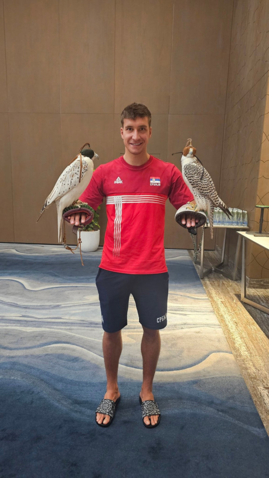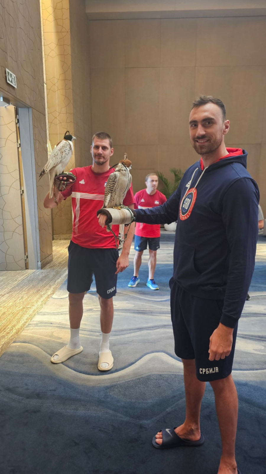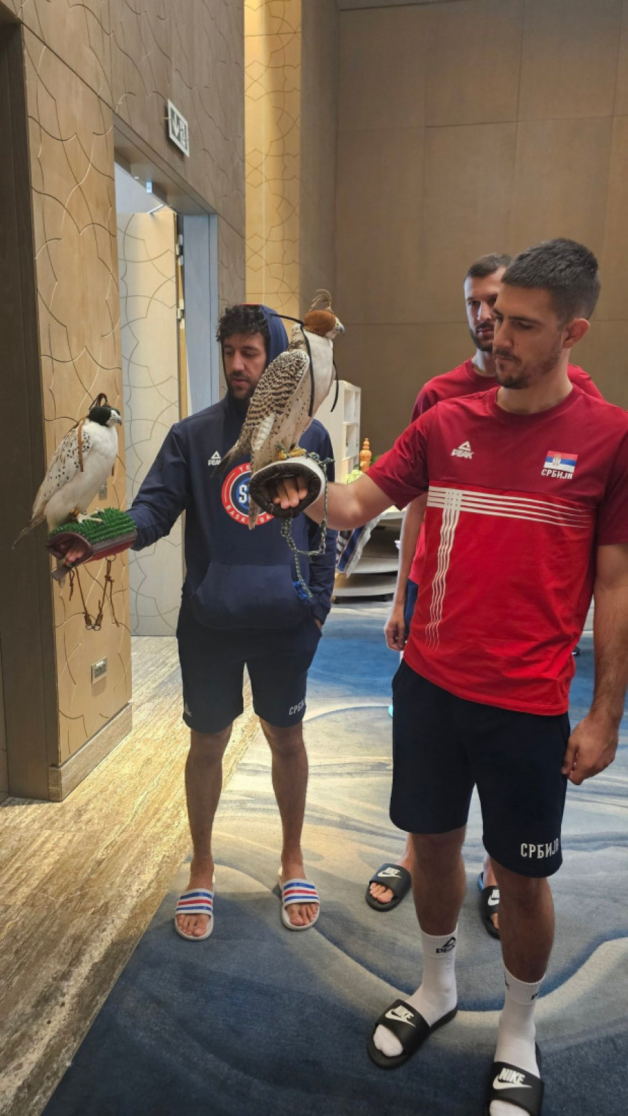 Tako su naši igrači mogli da drže ove ptice i fotografišu se sa njima, a Bogdan Bogdanović ih je mazio.
