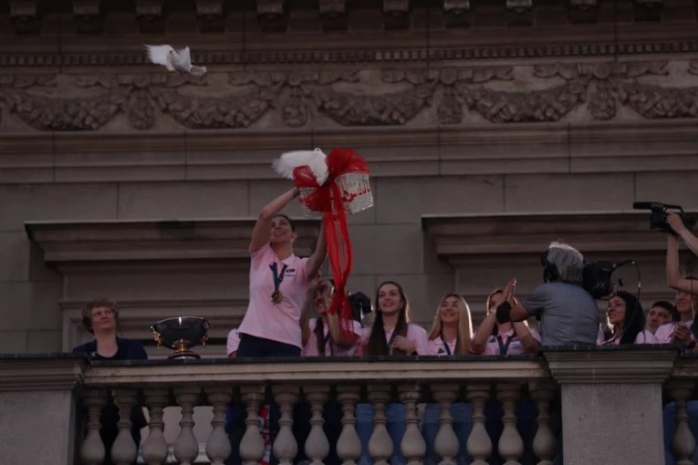 Izlazak zlatnih devojaka na balkon gradske skupštine, navijači su pozdravili gromoglasnim aplauzima, povicima “šampioni, šampioni”, a najveće ovacije dobile su Sonja Vasić, MVP turnira i članica idealne petorke turnira, i selektorka Marina Maljković.
