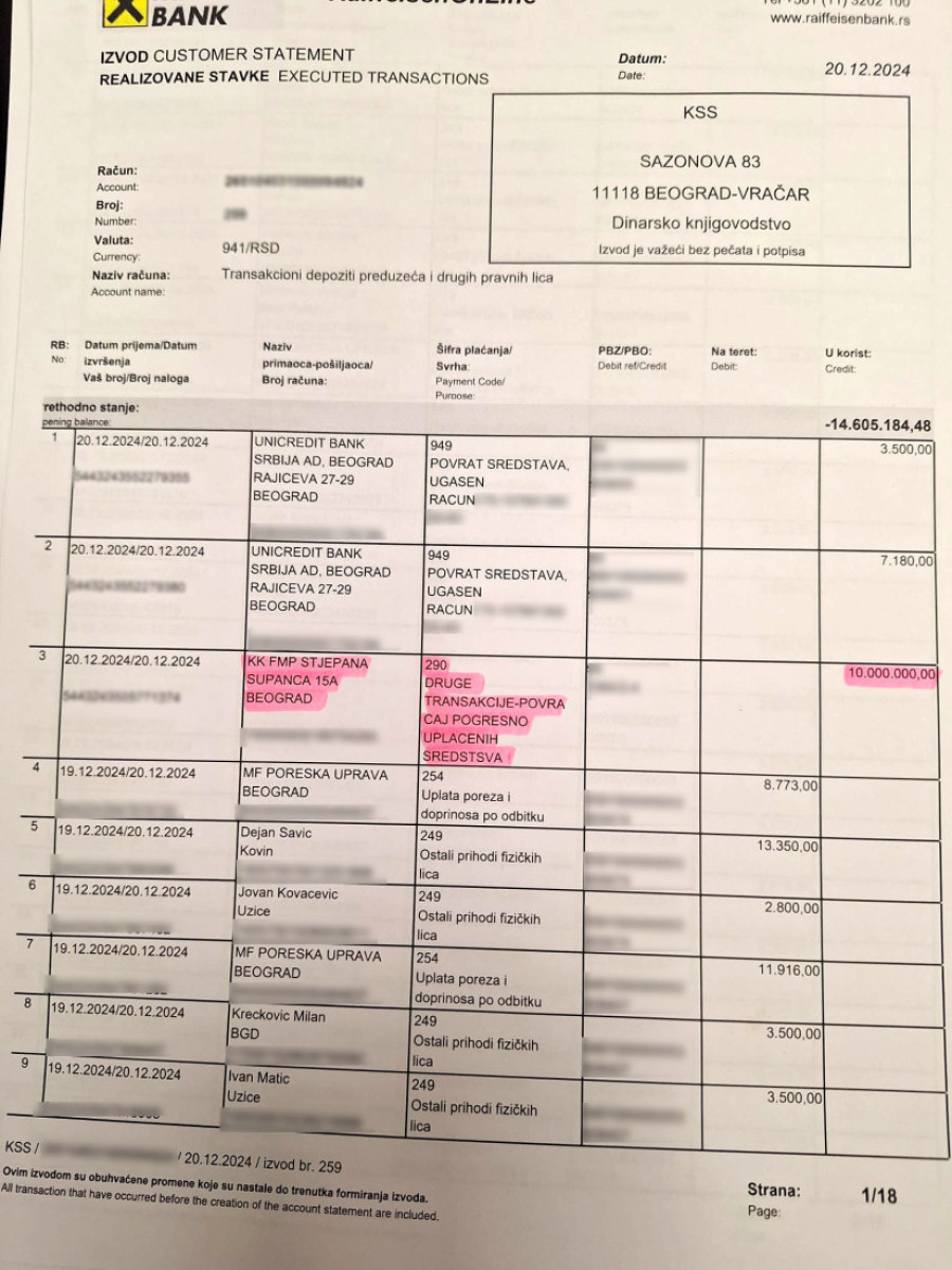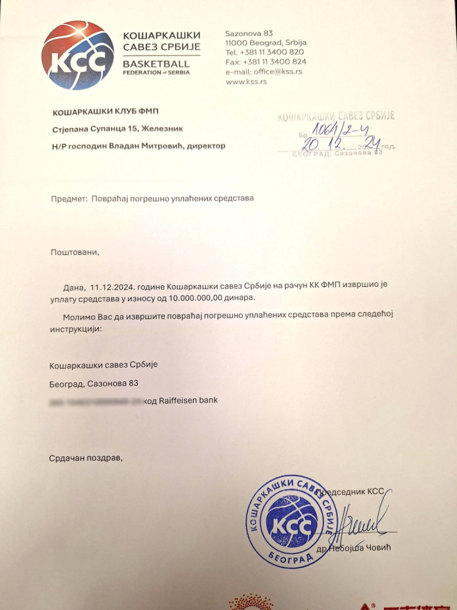 Košarkaški savez Srbije greškom je izvršio uplatu pomenutog iznosa na račun KK FMP 11. decembra 2024. godine, o čemu je klub iz Železnika obavešten i zamoljen da izvrši povraćaj pogrešno uplaćenih sredstava, što je KK FMP i učinio 20. decembra 2024. godine. O ovome svedoče tri dokumenta koja su u prilogu - izvod o uplati novca na račun FMP, zahtev predsednika KSS dr Nebojše Čovića za povraćaj sredstava i izvod da je KK FMP izvršio povraćaj sredstava.