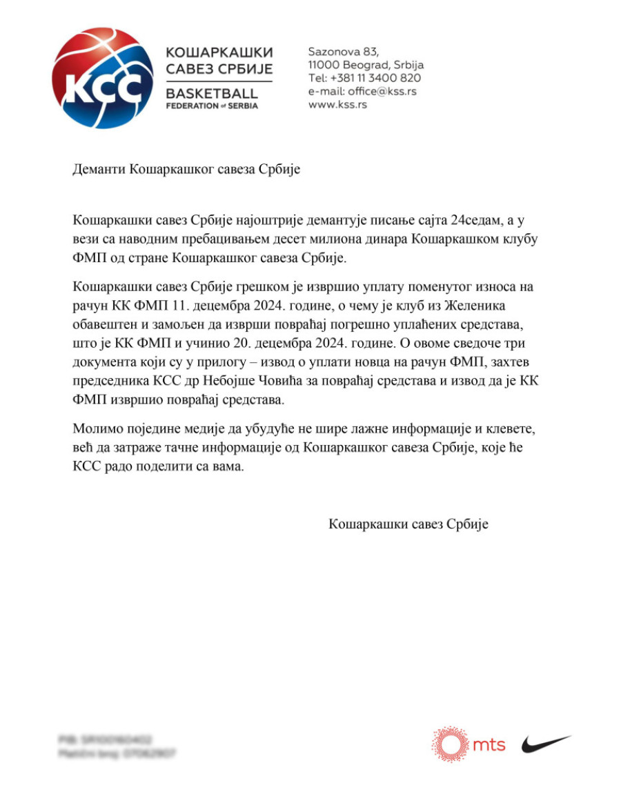 - Košarkaški savez Srbije najoštrije demantuje pisanje sajta 24sedam, a u vezi sa navodnim prebacivanjem deset miliona dinara Košarkaškom klubu FMP od strane Košarkaškog savez Srbije.