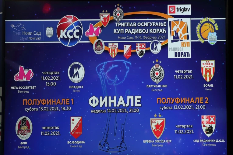Cela sezona jeste čudna, ali jedno je sigurno – trofejima niko neće gledati u zube. Danas u Novom Sadu počinje borba za prvi. Parovi četvrtfinala Kupa Radivoja Koraća su Mega Soccerbet – Mladost (15.00), FMP – Vojvodina (17.00), Partizan – Borac (19.00), Crvena zvezda – Radnički (21.00).