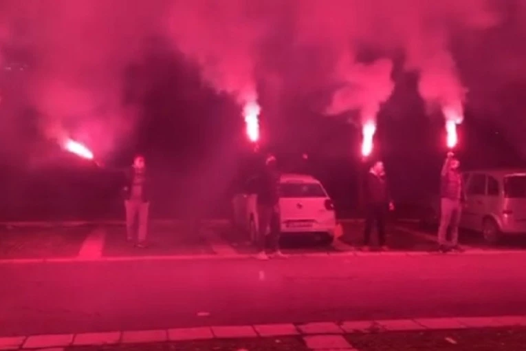 Naime, crveno-beli su ekipno, s Malog Kalemegdana, krenuli put Novog Beograda, a uoči ulaska u autobus, nekoliko navijača ih je ispratilo pesmom i bakljadom.