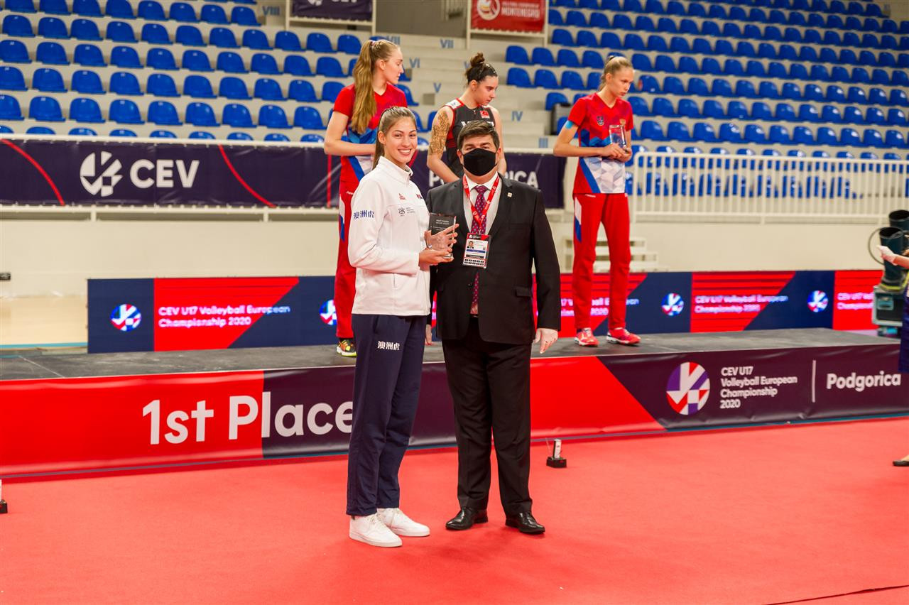 Podigle su se u meču za bronzu – a predvodila ih je sjajna Una Vajagić sa 20 osvojenih poena. Odličnu partiju pružila je i Hena Kurtagić, koja je u pobedi učestvovala sa 17 poena, od čega čak 10 blokova. Ona je na kraju zauzela mesto i u idealnoj postavi – proglašena je za najboljeg blokera Evrope u svojoj generaciji (2004). Uzdanica TENT-a je istu nagradu nedavno osvojila i na Evropskom prvenstvu za juniorke u Zenici (2002.godište), a sada je blokersku dominaciju samo potvrdila…