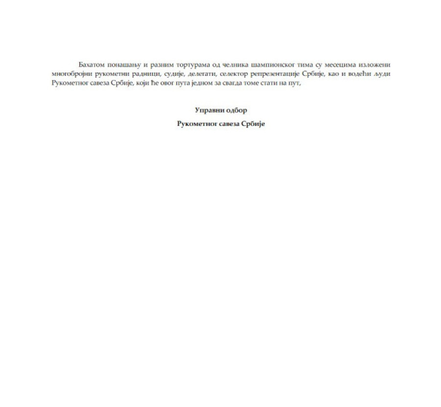 Ono što je najbolnije saznanje je da rukometne reprezentacije Srbije, koje svakom pristojnom i čestitom sportskom radniku i entuzijasti treba da služe na ponos i čast, sada već očigledno "smetaju" upravo onima koji bi trebalo po sopstvenim htenjima i ostvarenim rezultatima u poslednje vreme da budu glavni nosilac razvoja i sveukupnog boljitka rukometnog sporta.