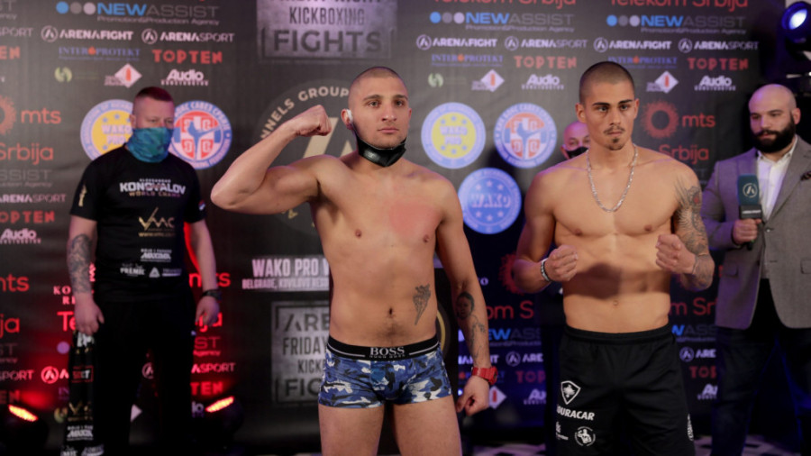 Iza kulisa je bilo posebno zanimljivo. Mrštenje, mrki pogledi na merenju, ali i izjave prepune komlimenata. Centralni meč biće megdan za upražnjeno mesto profesionalnog prvaka sveta WAKO PRO federacije u kategoriji do 66.8kg u disciplini lou kik. Snage će odmeriti Aleksandar Konovalov i Andre Santoš u pet rundi od po tri minuta.