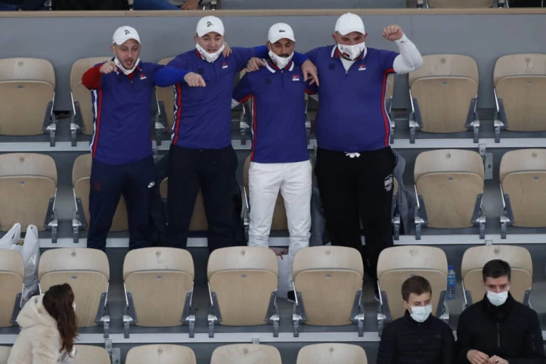 Novak Đoković i pored toga što je bio ograničen broj publike nu finalu na Filipu Šatrijeu, prvi reket sveta ima podršku sa tribina. Njih četvorica sve vreme pokušavaju da daju podršku našem igraču, kako bi uspeo da stigne do drugog pehara na Rolan Garosu.