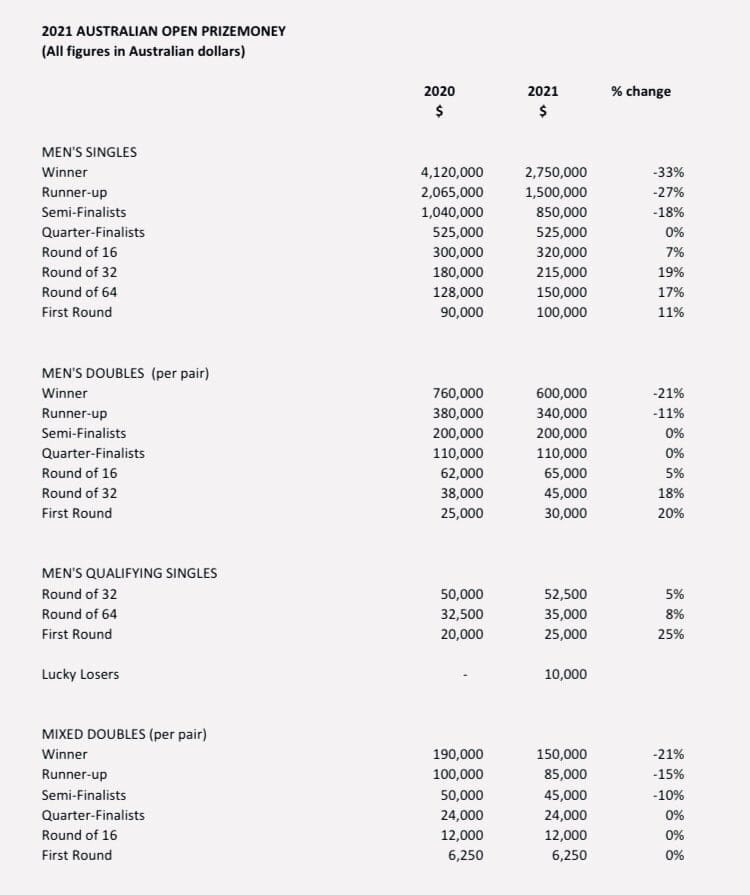 Pobedniku će pripasti 2.750.000 australijskih dolara (prošle godine 4.120.000) što je za 33 odsto manje. Finalisti će pripasti 1.500.000 (2.065.000) što je za 27 odsto manje. Polufinalista dobija 850.000 (1.040.000) što je 18 odsto manje. Jedino promene nije bilo za četvrtfinale i prošle i ove godine je ista cifra – 525.000.