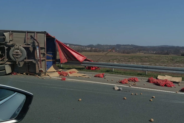 Žestok sudar na auto-putu "Miloš Veliki": Kamion prevrnut, krompir rasut po kolovozu (FOTO)
