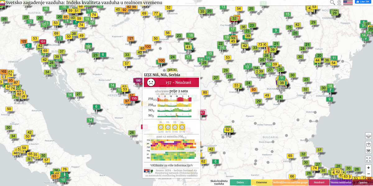 Prema merenjima na sajtu Agencije za zaštitu životne sredine vazduh u Nišu danas je ocenjen kao zagađen i tako je ovaj grad danas najzagađeniji u Srbiji.