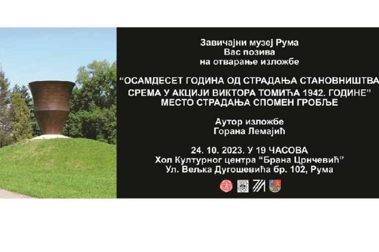 U utorak, 24. oktobra, u 19 časova, u Holu kulturnog centra Brana Crnčević u Rumi, biće otvorena izložba "Osamdeset godina od stradanja stanovništva Srema u akciji Viktora Tomića 1942. godine – mesto stradanja Spomen groblje", autorke istoričarke Gorane Lemajić.