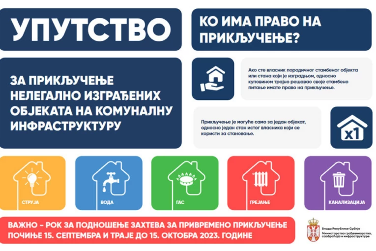 Vlada Republike Srbije je 23.8.2023. godine usvojila Uredbu o postupku privremenog priključenja nelegalnih objekata na elektroenergetsku mrežu, gasnu mrežu, mrežu daljinskog grejanja, vodovod i kanalizaciju. Ova uredba počinje da se primenjuje od 15.9.2023. godine.