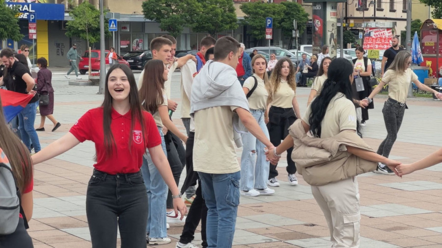 Veseli i mladi maturanti svih čačanskih srednjih škola su i dalje i te kako dobrog raspoloženja, pa su kroz centar grada na novoj pešačkoj zoni opleli veliko dobro poznato srpsko užičko kolo.
