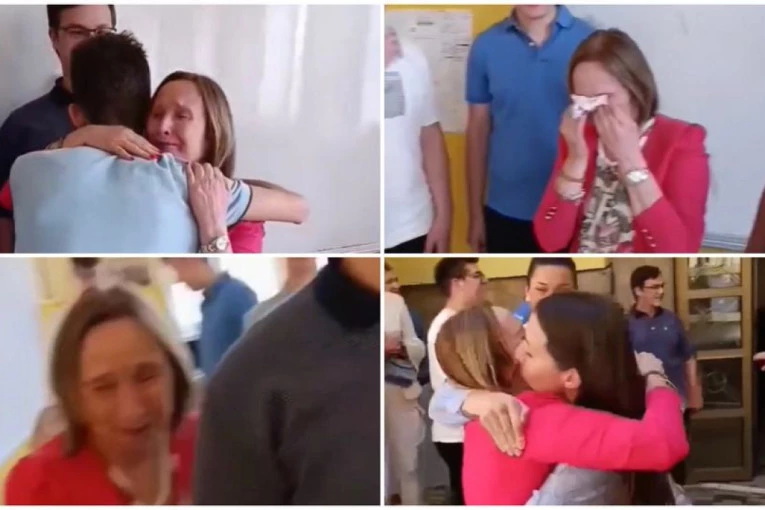 Već na ulasku u učionicu u njenim očima su se mogle videti suze, a emocije su je tek preplavile onog momenta kada je kročila u hodnik i videla na stotine sadašnjih, bivših đaka, njenih kolega nastavnika kako joj aplaudiraju na putu do školskog dvorišta.