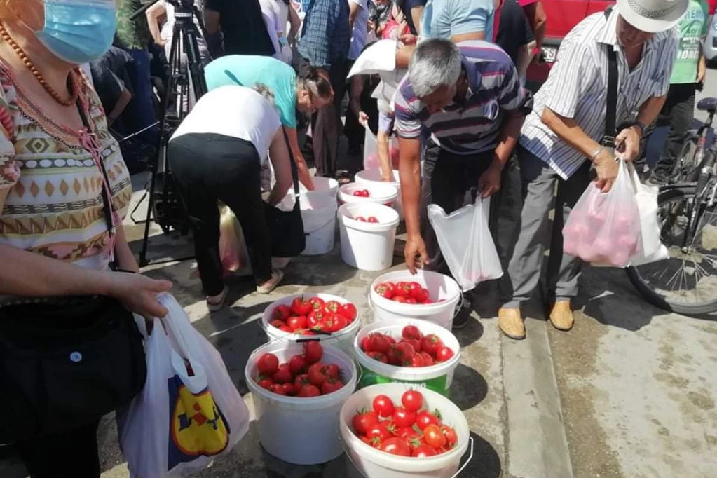 Ispred marketa “Lidl” i “Roda” u Mlinskoj ulici poljoprivredni proizvođači su za oko 30 minuta podelili nekoliko tona paradajza, a kako sami kažu, razlog za takvu odluku, pored niske cene, je i to što su prethodnih godina dobijali kritike zašto ne dele građanima besplatno paradajz, a ne da ga rasipaju po deponijama.