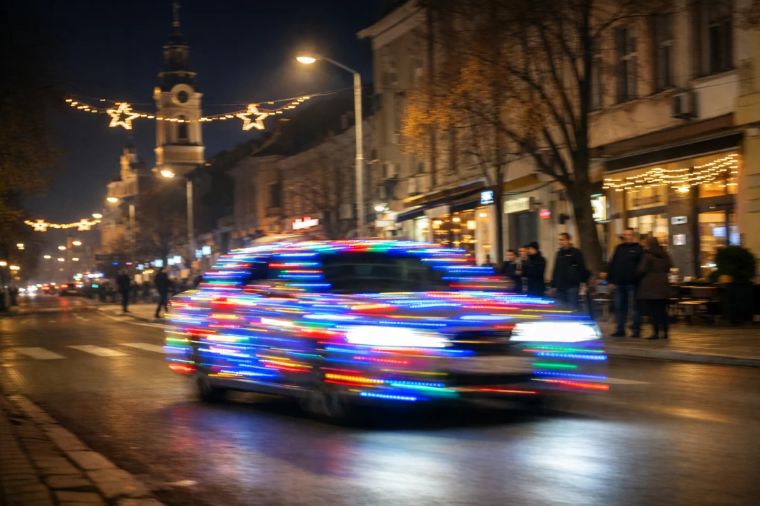 Vozilo je u potpunosti ukrašeno svetlucavim lampicama i izgleda šareno poput novogodišnje jelke, zbog čega je momentalno privuklo pažnju.