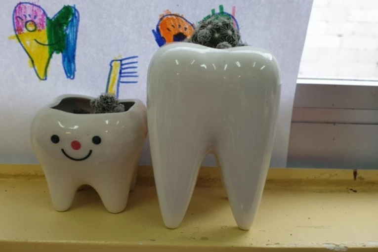 – Prva asocijacija na zubara je tup zvuk burgije i jeza koja prolazi i odrasle. Vodili smo se time da se kod dece izgubi strah od dolaska kod zubara, kako bi jednog dana imali lepe i zdrave zube. Krenuli smo od sređivanja čekaonice, a potom i same ordinacije. Nabavili smo i saksije u obliku zuba, a svako dete koje izvadi prvi zub, umesto “Zubić vile” od nas dobije poklon u vidu stikera, pečata za hrabrost i kutije u obliku zuba da može da ga čuva * rekla je dr Marija Mijailović stomatalog i idejni tvorac ovakve ordinacije.