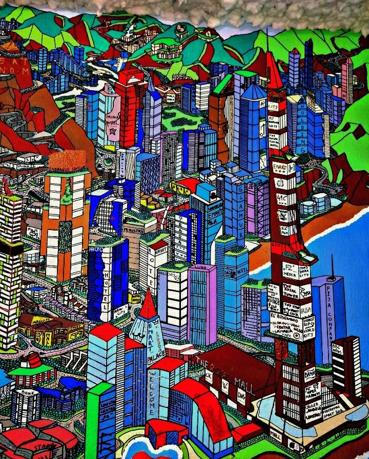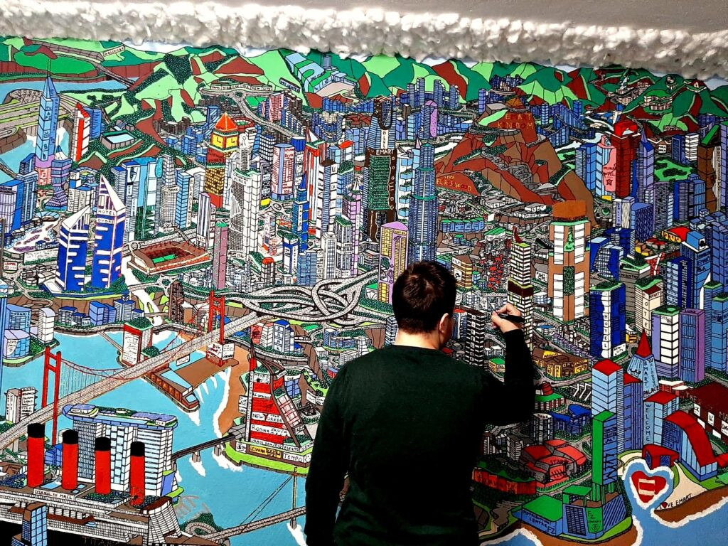 Na samom početku nacrta skicu na papiru na kojoj su obeležene reke, planine, centar grada i industrijska zona, najvažnije saobraćajnice i vazdušne luke. Nakon skice, počinje crtanje grada olovkom, a zatim markerima i flomasterima oživlja crtež i vrlo često spaja više radova u jedan.