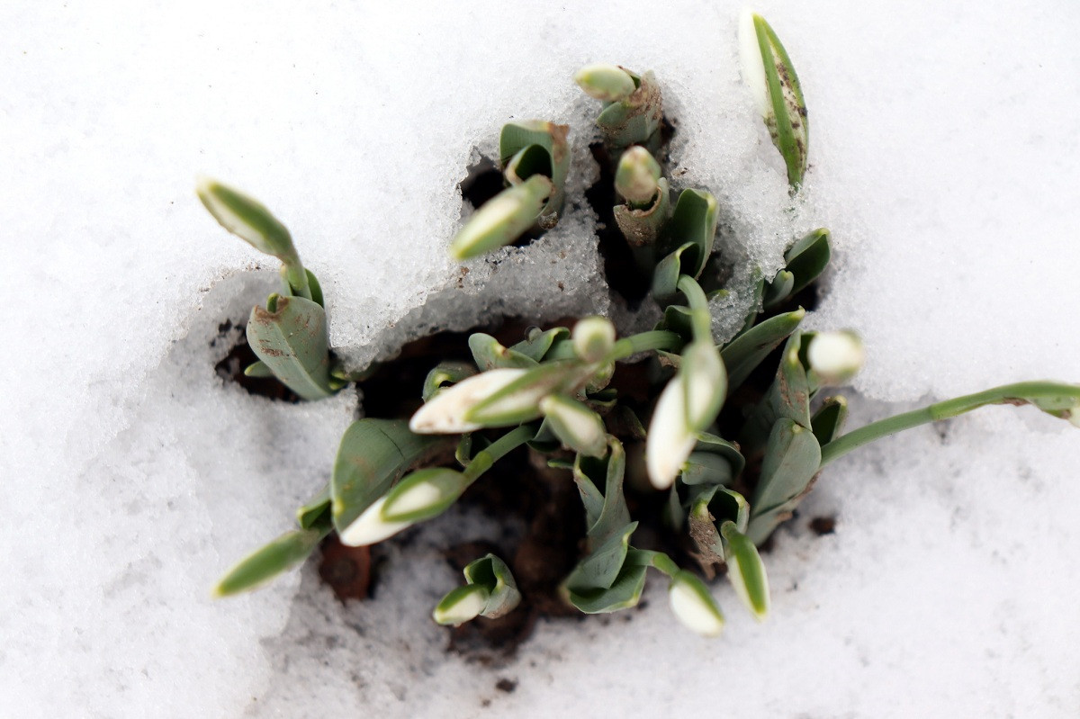 Beli, još nedovoljno rascvetali cvetovi, na zelenim stabljikama, probili su se kroz snežni pokrivač